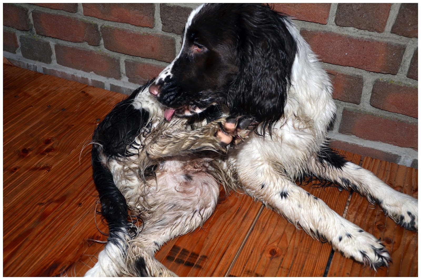 Hallo Clooney, dein Schmuddelfell hat mich so an meine Schmuddelwanderschuhe erinnert. Die sahen nach einem Spaziergang genauso aus! Also ich habe sie natürlich nicht sauber geleckt - das können Menschen nicht. Ich musste sie unters fließende Wasser halten (das hörst du jetzt wahrscheinlich nicht so gerne... aber bevor Herrchen das liest, bist du schon sauber...)