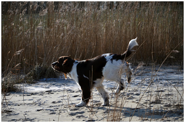 ich bin auch ein Jagdhund, aber hier am Strand laufen zum Glück nicht so viele Hasen oder Rehe rum. Ich jage dann lieber anderen Hunden nach.