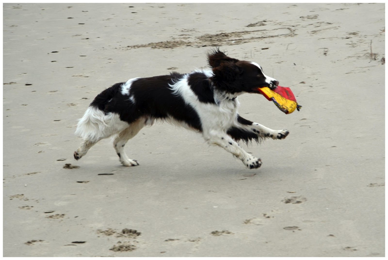 Doch dann sah ich auf einmal etwas wirklich Neues, was Herrchen aus der Tasche holte. Sowas Ähnliches hatte ich schon mal bei Deco und Lilly im Blog gesehen. Dieses hier aber war bunt und ein bisschen anders, aber trotzdem wollte ich es haben. Herrchen hat dann mit dem Ding vor meiner Nase rumgefuchtelt und es dann weggeworfen. Es segelte erst ganz langsam durch die Luft und ich rannte hinterher und holte es. Dann sollte ich das zu Herrchen zurückbringen. „Aus“ war sein Kommando, aber ich wollte mein neues Spielzeug nicht gleich wieder hergeben. Ich Herrchen zog wie ein Irrer daran und dann war es kaputt. Hatte ich er doch mein neues Spielzeug gleich kaputt gemacht. So ein Mist! Aber so konnte man da auch noch ganz gut mit spielen.